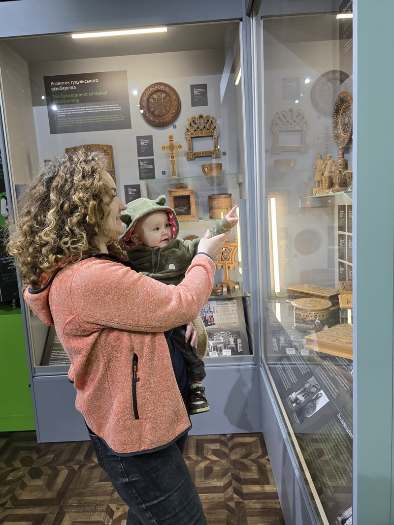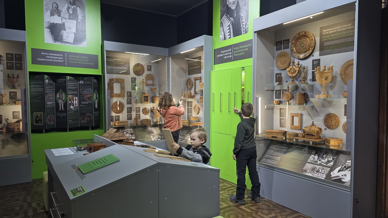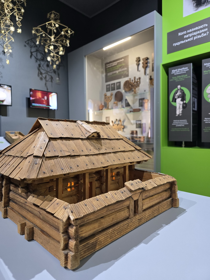 Також тут можна познайомитися з історіями видатних митців через рухомі панелі з інфографікою та архівними світлинами, а сенсорний моноблок надає додаткову інформацію про художню обробку дерева.