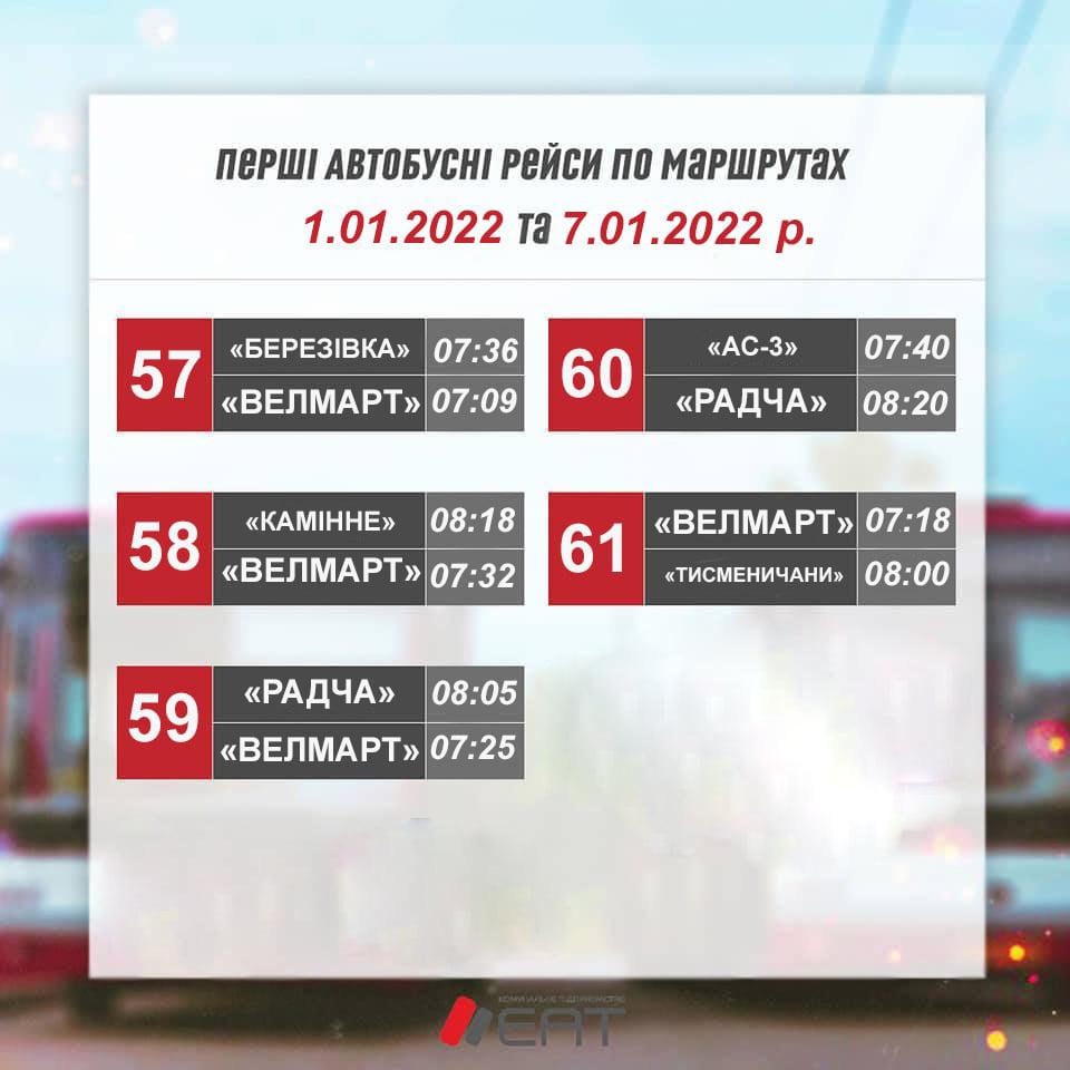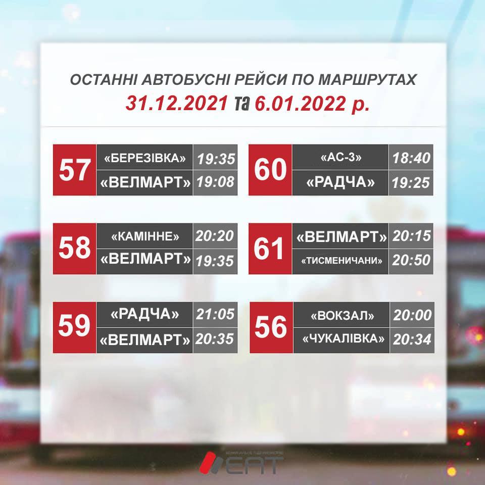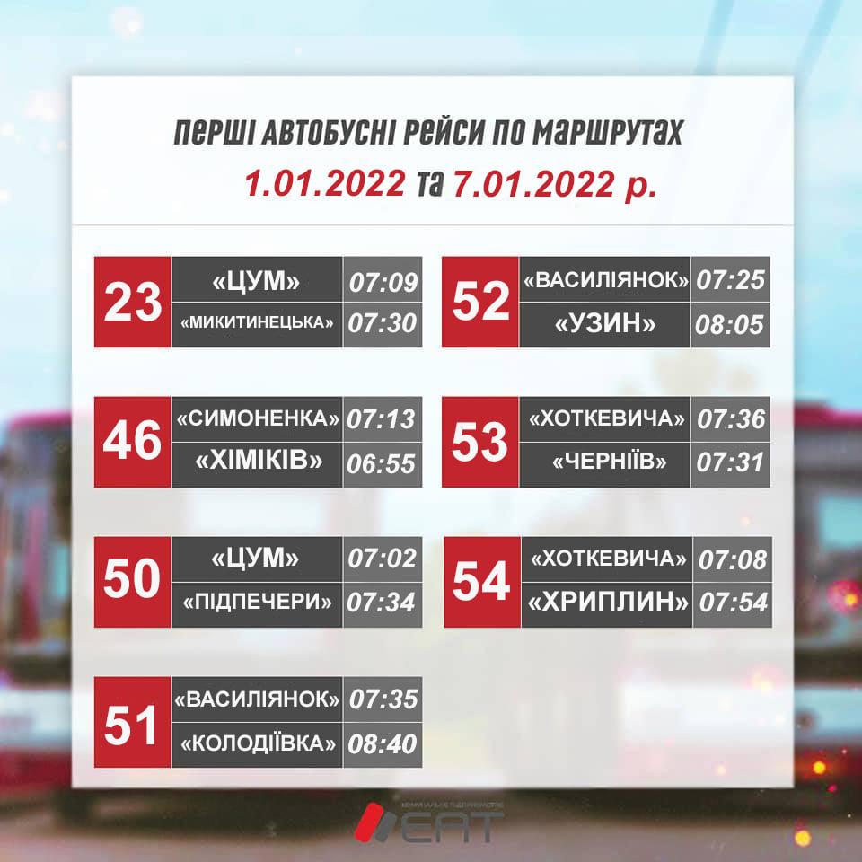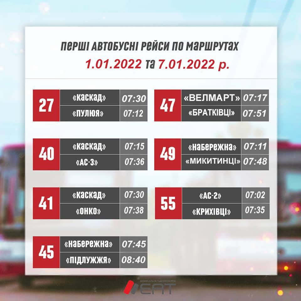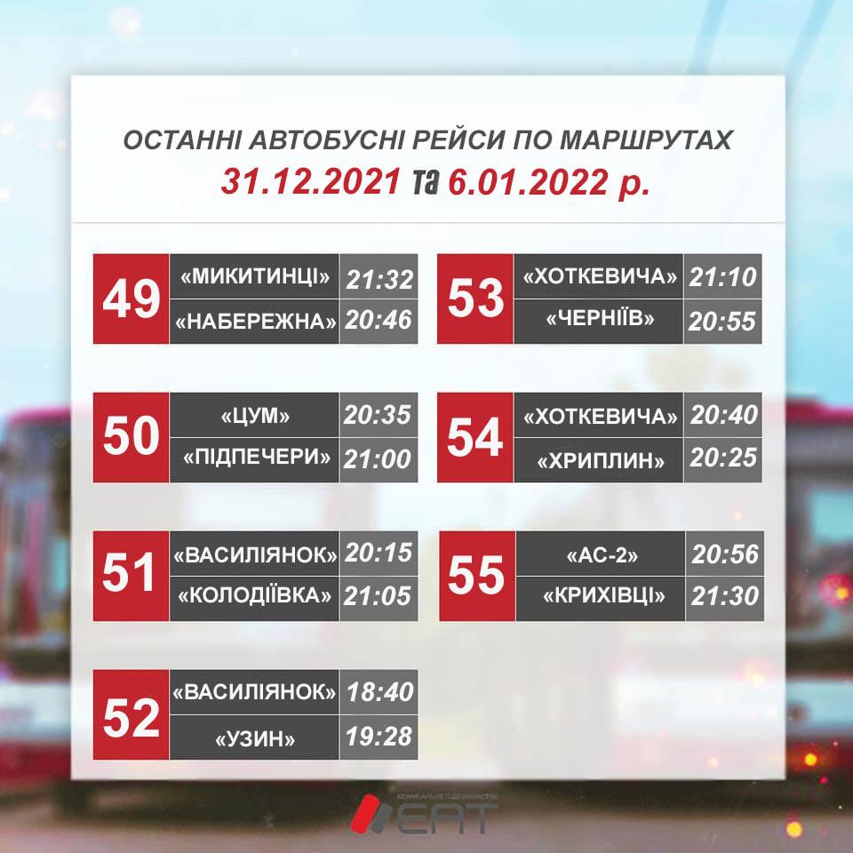 Також у КП звернули увагу, що 31 грудня та 6 січня деякі останні рейси будуть скасовані, а 1 та 7 січня виїзд транспорту відбуватиметься дещо пізніше.