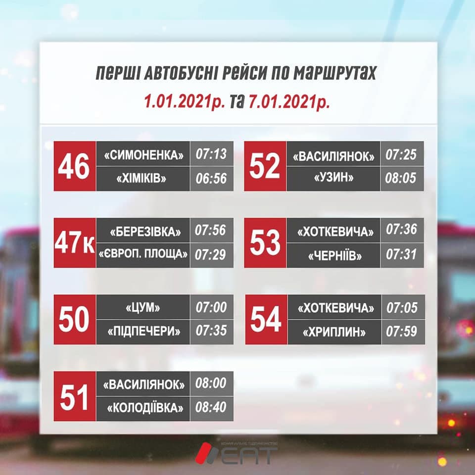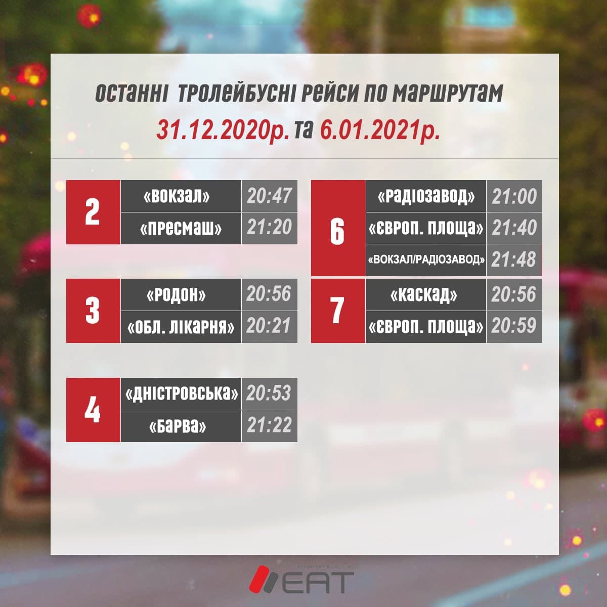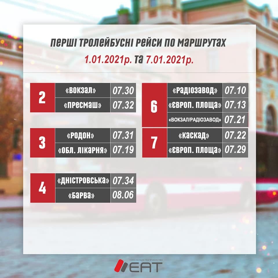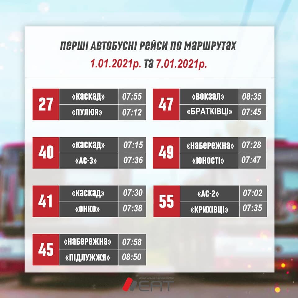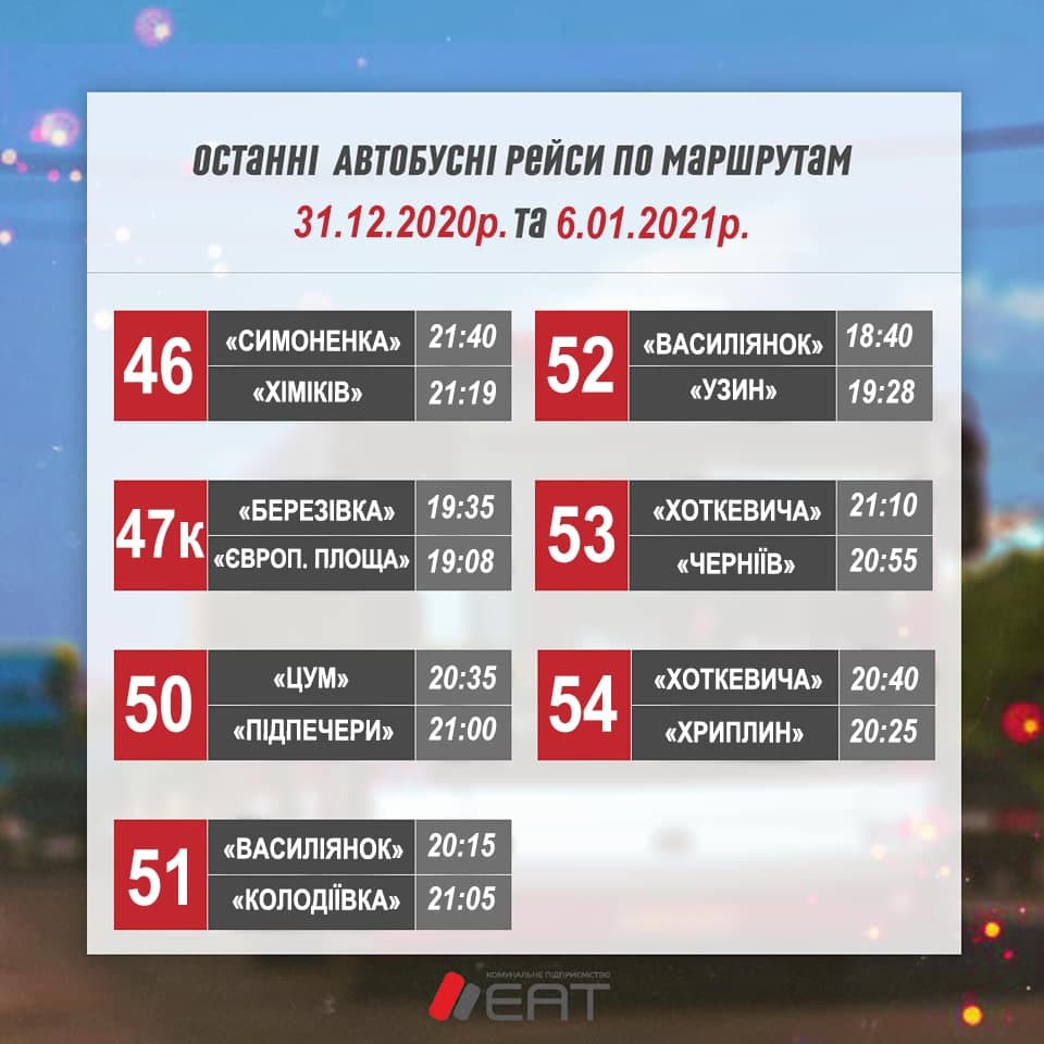 “У зв’язку з наближенням періоду різдвяно-новорічних свят повідомляємо про зміни в графіках руху автобусних та тролейбусних маршрутів, яке обслуговує наше підприємство.  Звертаємо вашу увагу, що 31 грудня та 6 січня деякі останні рейси будуть скасовані, а 1 та 7 січня виїзд транспорту відбуватиметься дещо пізніше. Детальніше про це у фото нижче”, – йдеться у повідомленні.