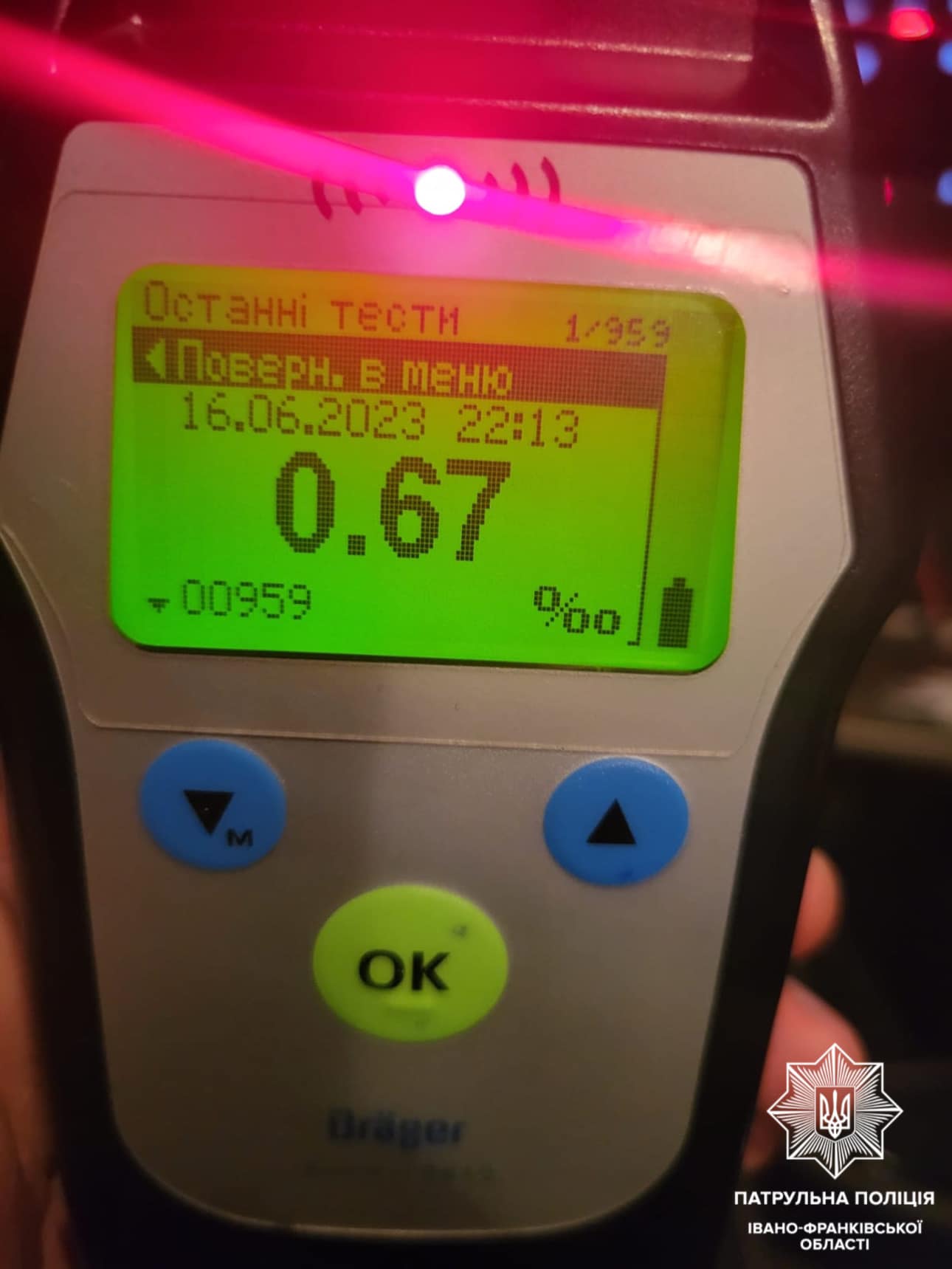 У п’ятницю, 16 червня, на вулиці Довженка патрульні зупинили скутер Suzuki за порушення правил дорожнього руху. Спілкуючись з водієм, інспектори помітили у нього ознаки алкогольного сп’яніння. Це підтвердив і результат Драгера — 0.67 проміле алкоголю в крові, інформують у патрульній поліції.