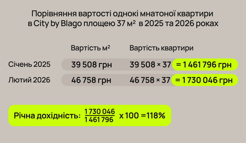 Сьогодні ринок пропонує безліч варіантів. Щоб унаочнити, як працює така інвестиція, за приклад ми взяли однокімнатну квартиру площею 37 м² в комплексі City by blago, здача перших секцій в якому запланована вже на наступний рік. Отже, якщо на початку 2025-го вона коштувала 1,46 млн грн, то зараз 1,73 млн грн. Тобто лише за рік вартість квартири збільшилася приблизно на 270 тисяч гривень, або 18%. Іншими словами, купивши нерухомість, інвестор за рік отримав значно більше, ніж якби відкрив депозит чи придбав державні облігації.
