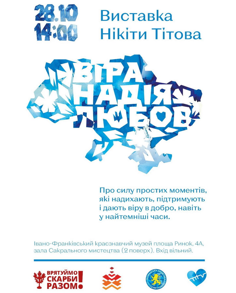 У вівторок, 28 жовтня, о 14:00 у залі сакрального мистецтва Івано-Франківського краєзнавчого музею відбудеться відкриття виставки Нікіти Тітова «Віра. Надія. Любов». Вхід — вільний.