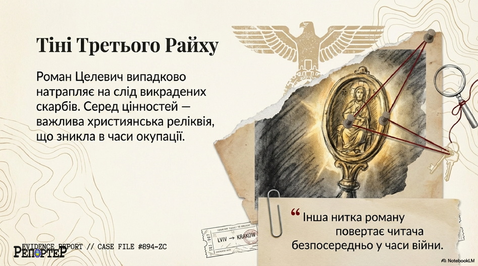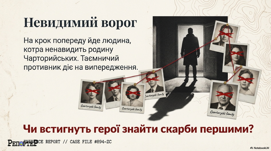 У розслідуванні журналісту допомагає вже знайомий читачам за попереднім твором автора вчитель історії Марко Шептицький. З’ясовується, що герої є сусідами в одному з будинків у центрі Івано-Франківська, проте до початку пригод не були знайомі. Протистоятиме їм таємнича організація «Кастра Преторія», що сягає корінням часів Римської імперії, та невідомий ворог, який відчуває особисту ненависть до родини Чарторийських.