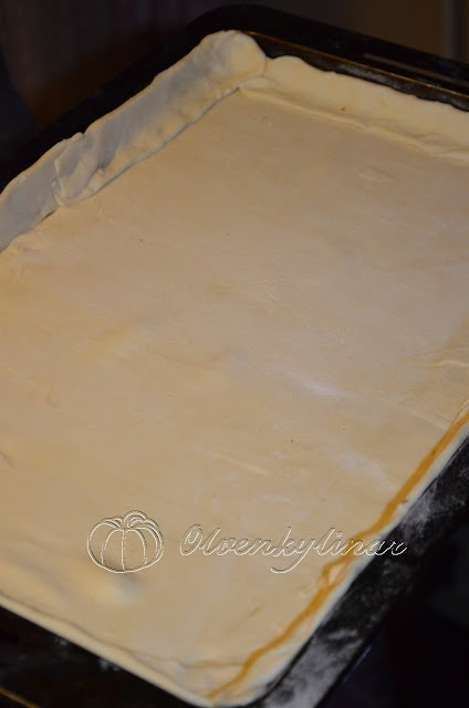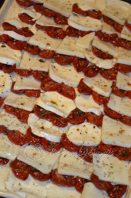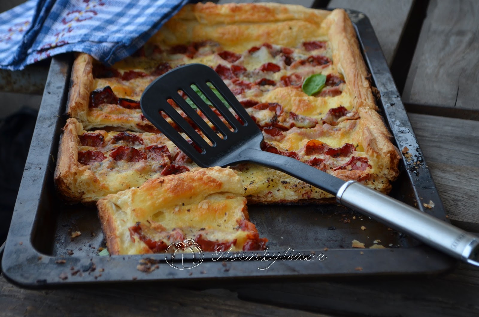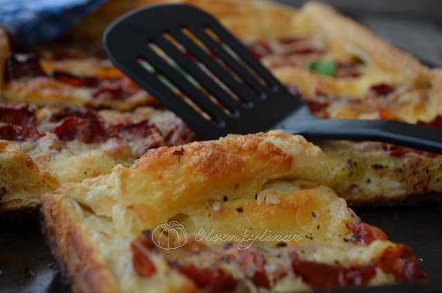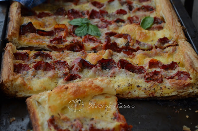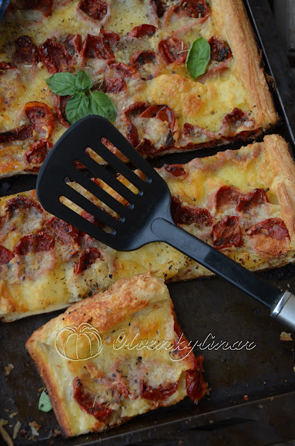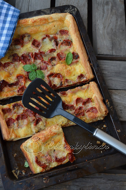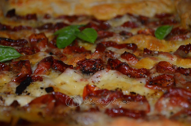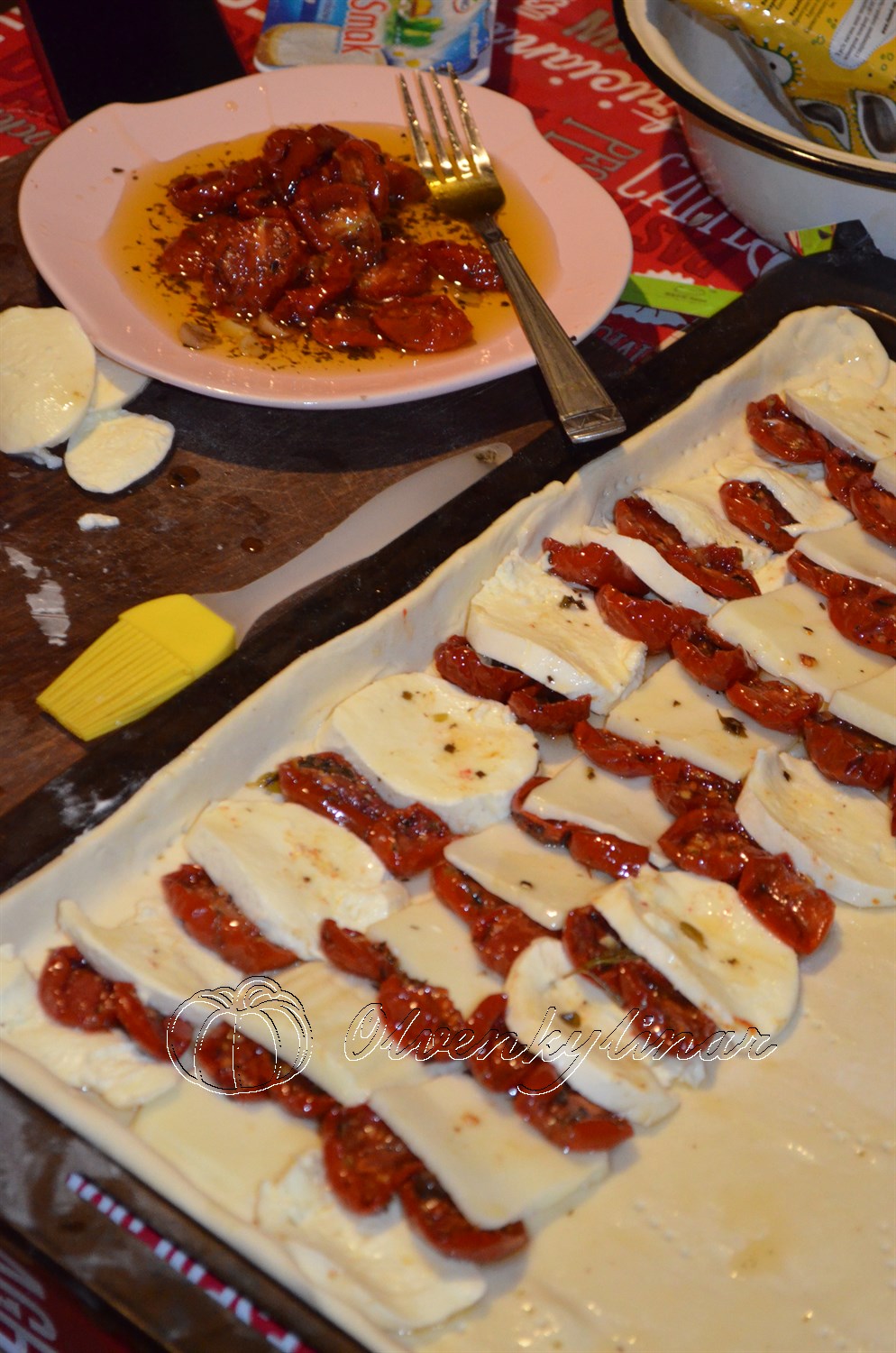 Інгредієнти: 1 пачка готового листового слойоного тіста (500 г),400 г моцарели, 1 банка в’ялених помідорів (0,5 л), готова суміш прованських чи італійських трав, листочки свіжого базиліку для прикрашення.Тісто розморозити, розкачати. Викласти на деко, розміром 25 на 40 см., сформувавши борти. Наколоти тісто виделкою.