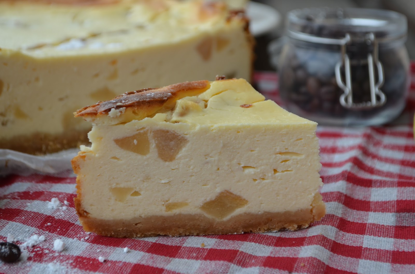 Інгредієнти: Корж: 220 г пісочного печива, 80 г масла. Маса: 950 г домашнього не кислого сиру, 250 г вершків, 1 пачка ванільного цукру або 1 ч. л. ванільного екстракту, 180 г цукру, 3 яйця, 4 ст. л. крохмалю, 500-600 г груш.