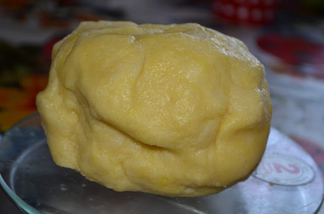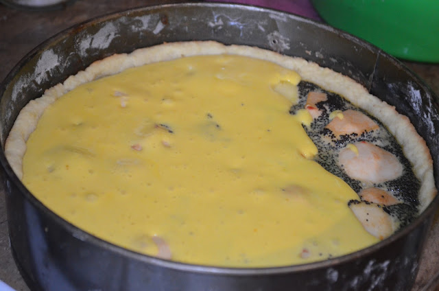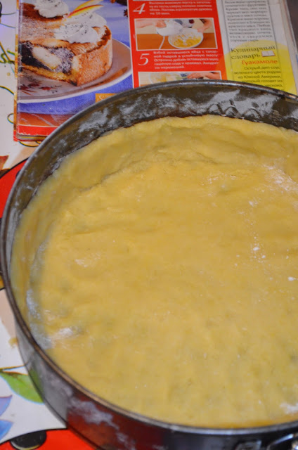 Форму діаметром 25-26 сантиметрів змащуємо маслом та посипаємо борошном. Тісто розкачуємо і викладаємо у форму, формуючи борти. Наколюємо тісто виделкою.