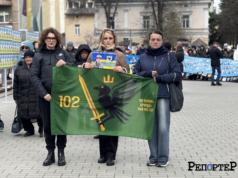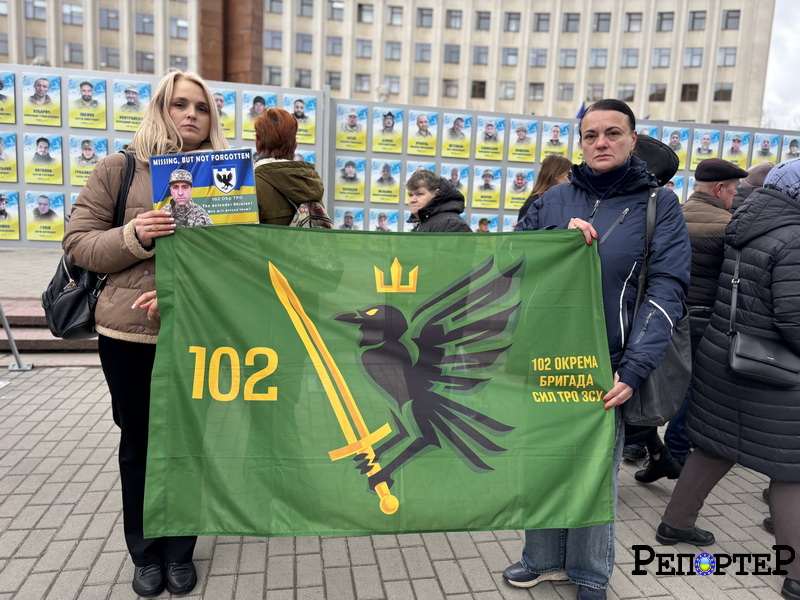 З прапором 102 бригади ТрО стоять Наталя Салук та Оксана Моспанюк. За словами координаторки об’єднання родин військових 102 бригади ТрО Наталії Салук, такі події побрібні, аби люди не забували, що продовжується війна, що продовжують зникати хлопці.