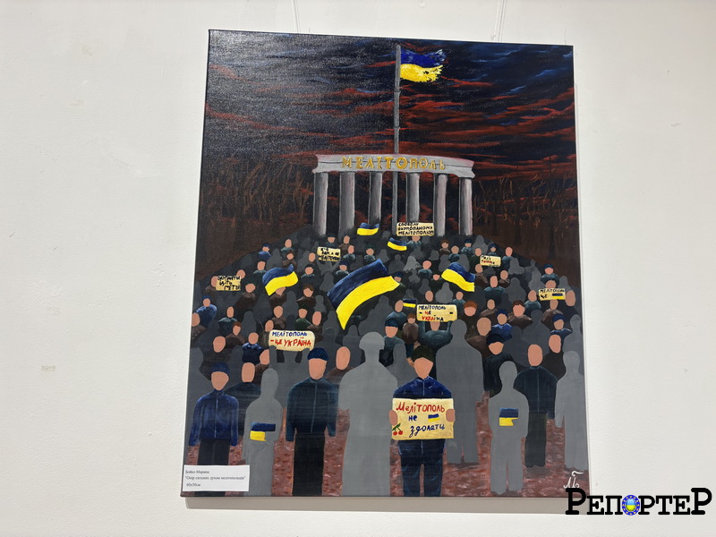 «Це про те, що мене хвилює дуже сильно. Це про те, як моє місто боролося навіть, коли вже було в окупації, – розповідає юна художниця. – Люди вийшли, щоб показати, що вони українці і що вони хочуть далі бути в складі України. Я зобразила їх без облич, бо їх дуже багато — і не всіх можна намалювати. Сірі постаті на картині символізують тих, кого вбили, або покалічили росіяни за те, що вони були українцями».
