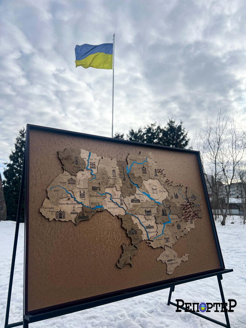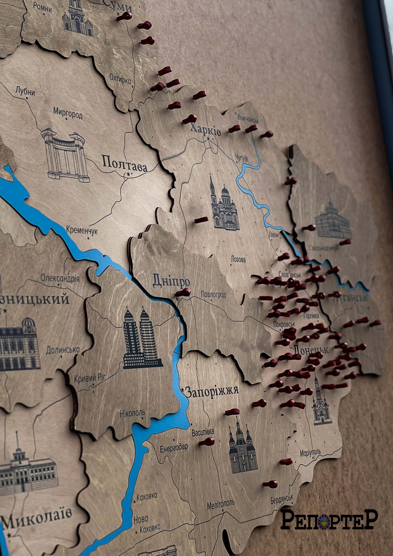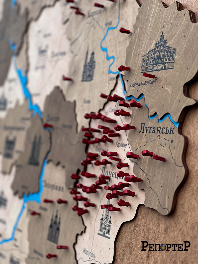 Це велика дерев’яна картина із зображенням карти України та всіх її областей. Під час заходу на ній з’являлися позначки — символи тих місць, де крайній раз виходили на зв’язок українські військові, які нині вважаються зниклими безвісти або перебувають у полоні, пише Репортер.