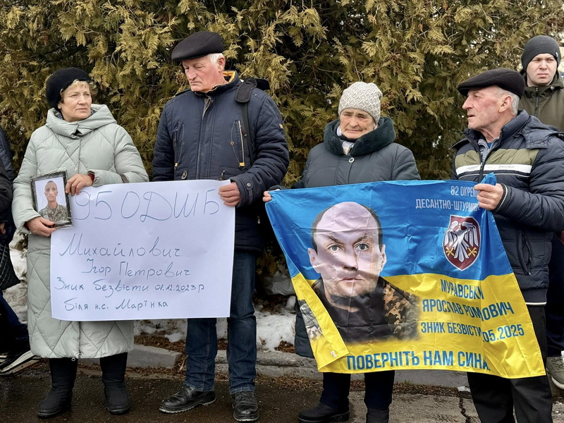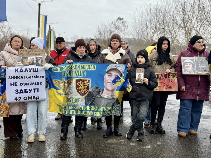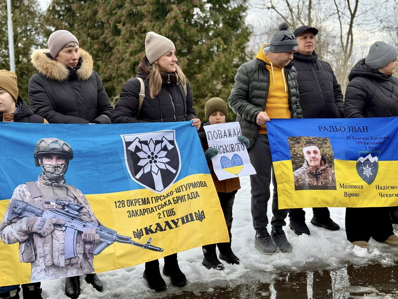 На подію зібралися понад сотню людей. Це рідні військових та небайдужі калушани. Родини тримали плакати та прапори з фотографіями рідних — тих, кого чекають додому.