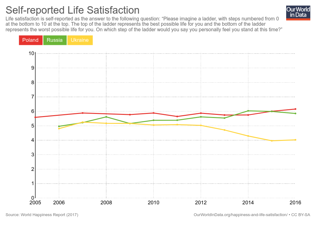 Задоволеність українців життям нижча, ніж у сусідів – і що характерно, росіяни стали задоволеніші, напавши на Україну, якраз коли українці стали менш щасливими: