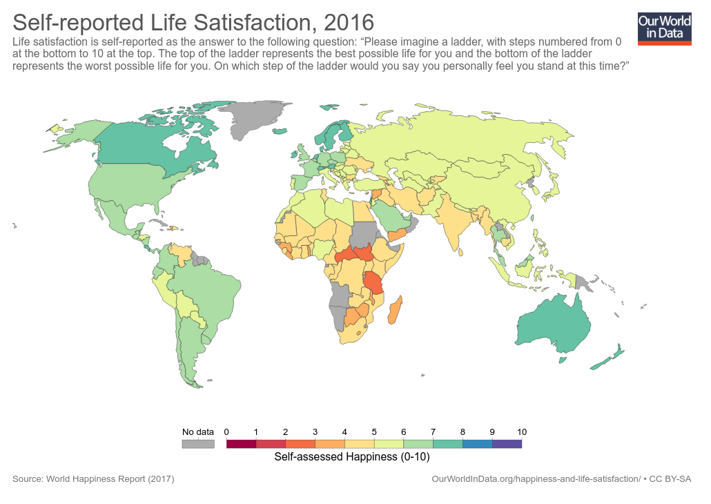 Нижче можна “погратися” з інтерактивною картою. В розділі chart можна обирати різні країни для порівняння з Україною. В розділі map можна подивитися, як змінювалася карта задоволеності життям із часом.