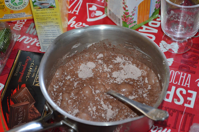 Спочатку перемішуємо сухі складники – цукор, ванільний цукор, крохмаль, сіль та какао.