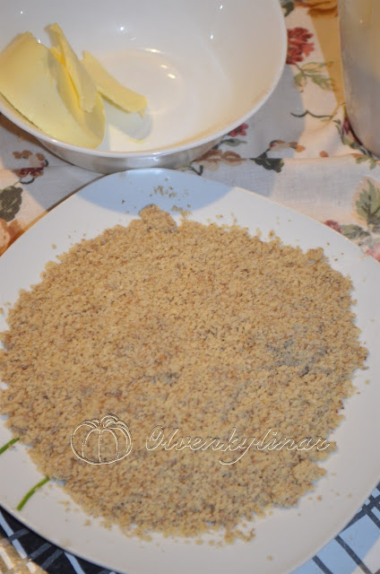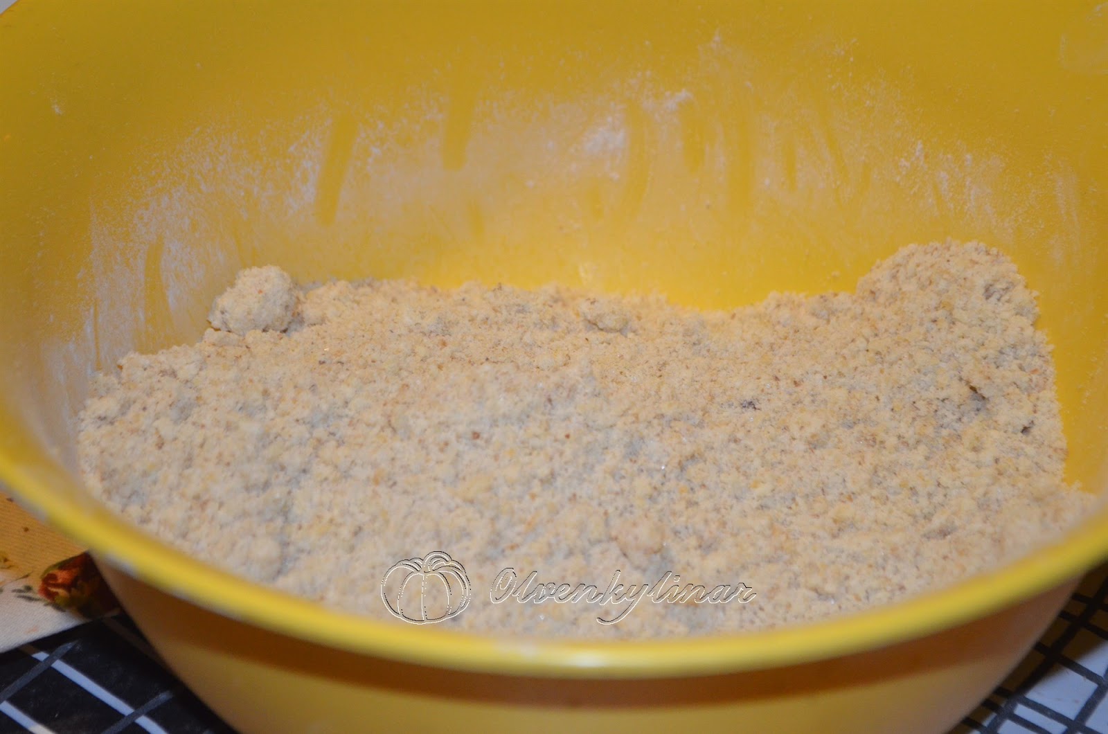 Борошно просіяти, змішати з цукром та подрібненими горіхами. Ретельно вимішати усі складники. Додати порізане холодне масло, швидко руками перетерти масло з борошном до утворення вологої крихти.