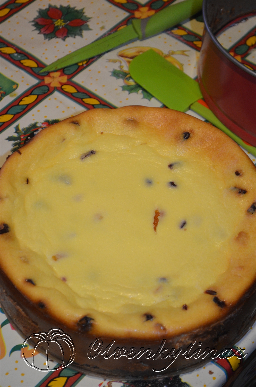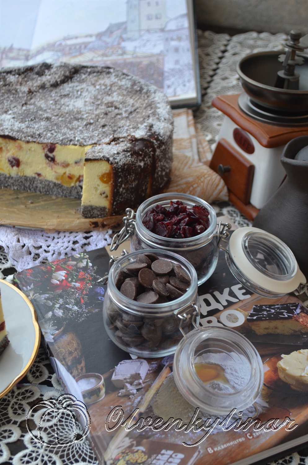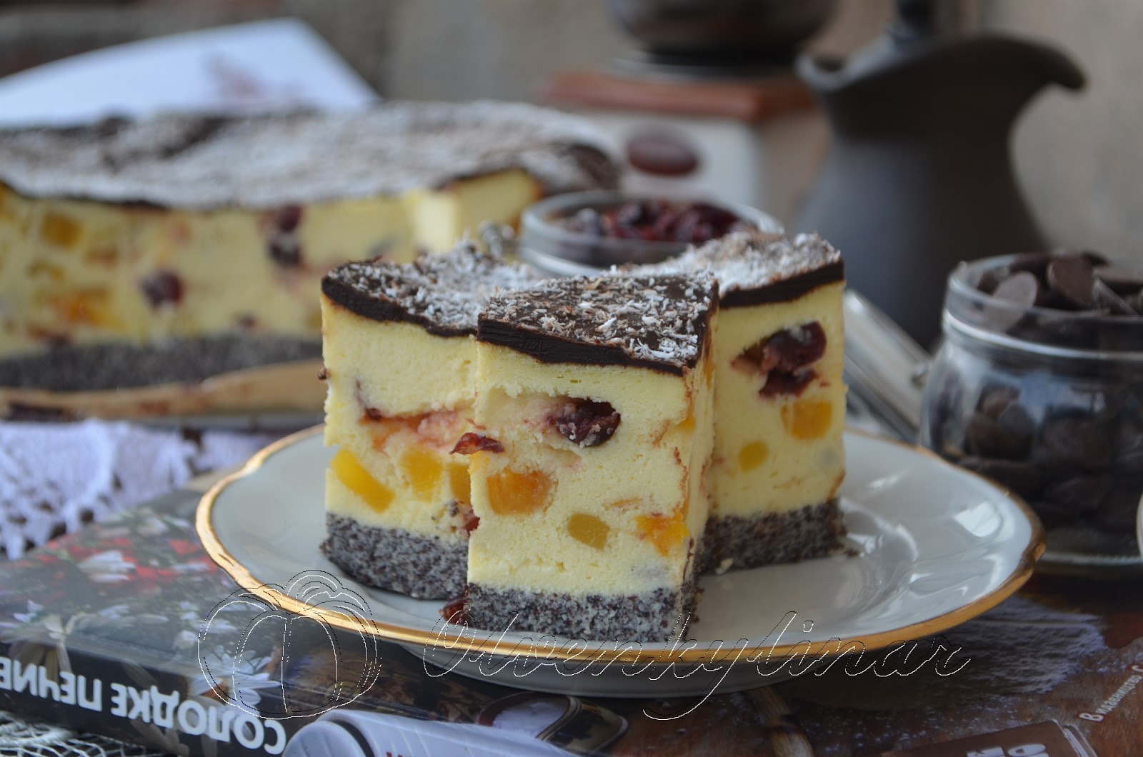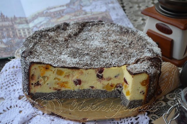 Інгредієнти: 1 кг сиру, 8 яєць, 200 г цукру, 150 г вершкового масла, сік і цедра одного невеликого лимона, кілька крапель лимонної есенції (за бажанням), 4 ст. л. кукурудзяного крохмалю, 4-5 ст. л. вершків або жирної сметани, 100 г перетертого маку, 100 г кураги, 100 г в’яленої журавлини, 50 г цукатів манго (сухофрукти беріть які завгодно, залежно від своїх уподобань). Помадка: 100 г чорного шоколаду, 60 г вершкового масла, 20 мл вершків або жирної сметани.