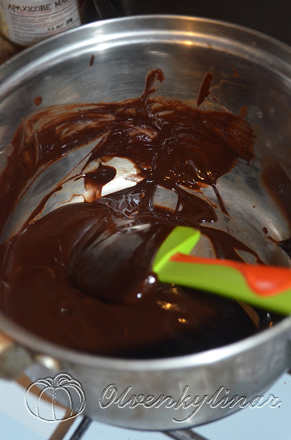 Тепер приступаємо до приготування помадки. У сотейнику змішати шоколад, вершки та масло, поставити на вогонь. Варити, постійно помішуючи, поки суміщ не стане однорідною і гладкою.