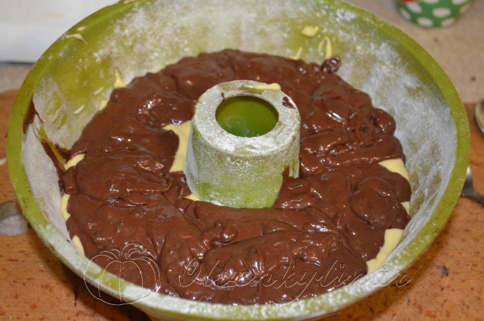 Інгредієнти: 200 г м’якого масла, 180 г цукру, 1 пачка ванільного цукру (16 г), 4 яйця, 250 г борошна, 1 ч. л. порошку до печива, 2/3 ч.л. соди, цедра з 1 апельсина, 170 г натурального йогурту без наповнювача, 3 ст. л. темного какао + 5 ст. л. гарячої води, 100 г дрібно посіченого чорного шоколаду. Глазур: 100 г білого шоколаду, 50 мл вершків 30-36%.