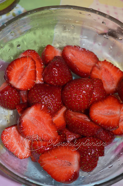 Тепер приступаємо до підготовки полуниці. Усі ягоди помити, просушити. 1 склянку полуниць порізати кубиками.