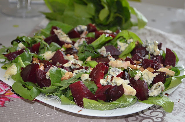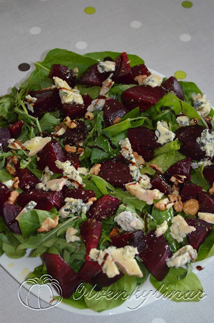 Інгредієнти: 2 невеликі молоді буряки (400 г), 1 пучок шпинату, 1 пучок руколи, 50 г грецьких горіхів, 100 г сиру “Дор Блю” (також підійде бринза чи будз), готова суміш прованських чи італійських трав, сіль, перець, оливкова олія, бальзамічний соус (опційно).