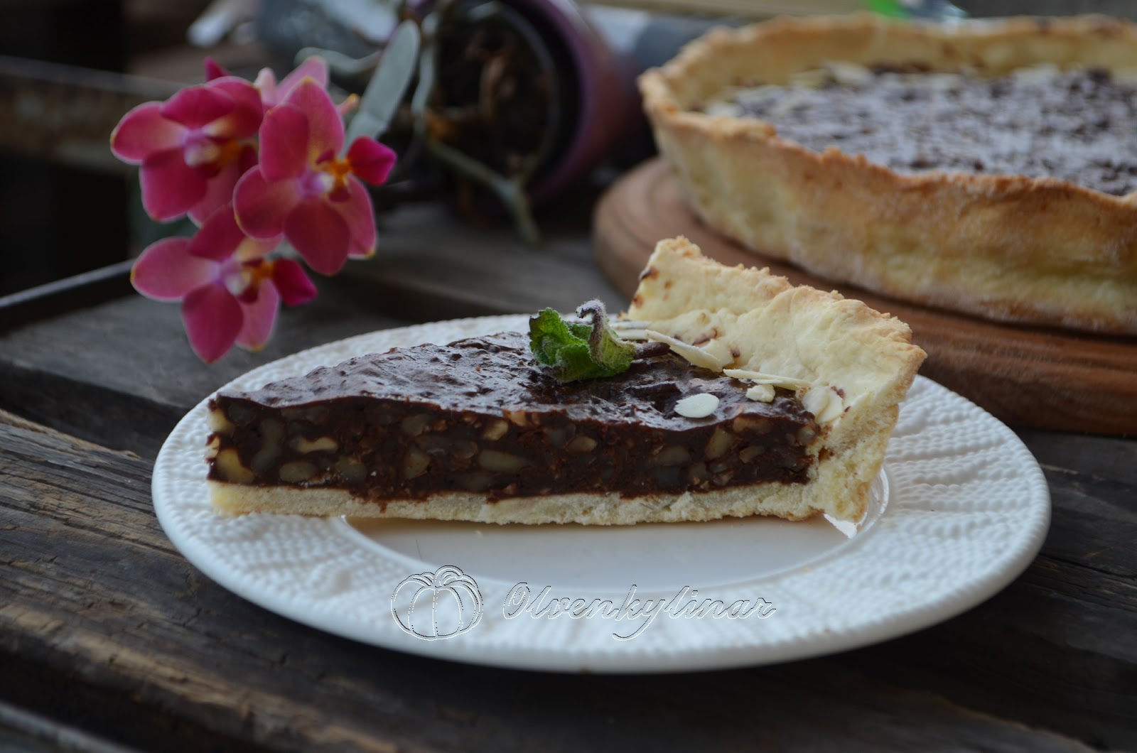 Інгредієнти. Тісто: 250 г борошна, 125 г масла, 60 г цукру, 1 яйце, дрібка солі, 2-3 ст. л холодної води.Начинка: 250 г грецьких горіхів, 250 г чорного шоколаду, 3 білки, 3 жовтки, 1 яйце, 1 ст. л. кукурудзяного крохмалю.