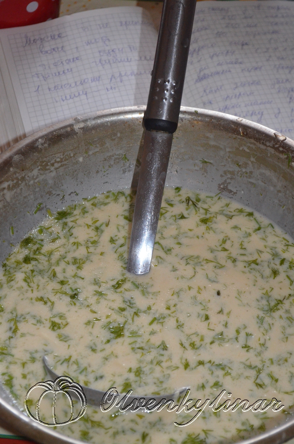 Інгредієнти: 2 яйця, 250 мл теплого молока, 250 мл теплої води, 170 г борошна, 120 г твердого сиру, 1 ч. л. солі, 1 ч. л. цукру, 1/2 ч. л. порошку до печива, 2 ст. л. олії, невеликий пучок кропу.