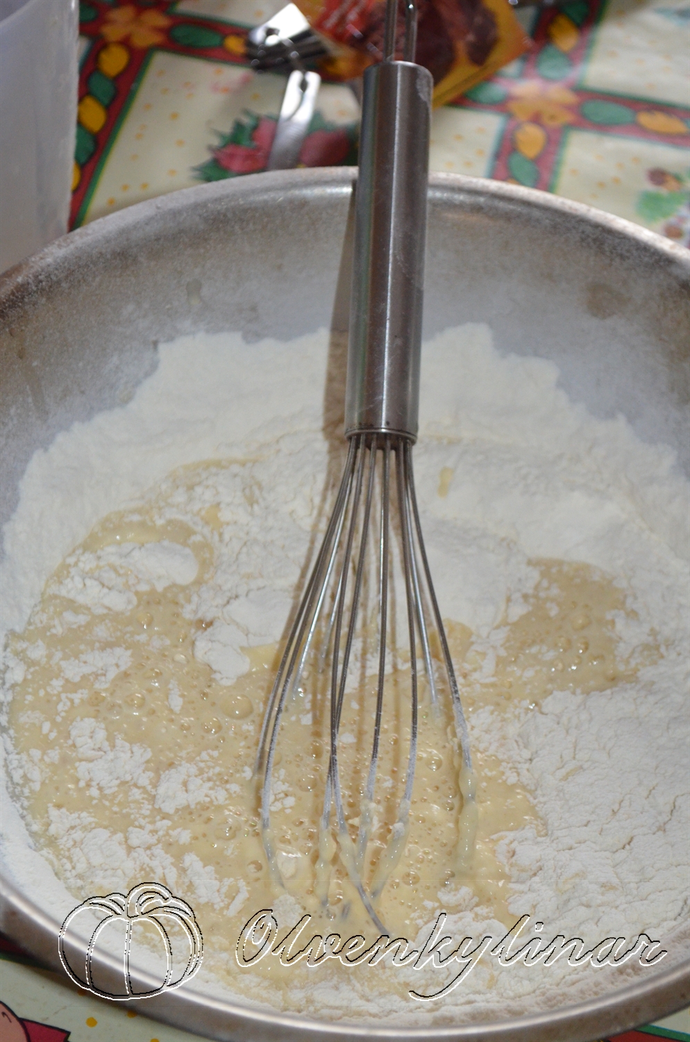 Всипати просіяне борошно та порошок до печива, перемішати до однорідної суміші без грудочок.