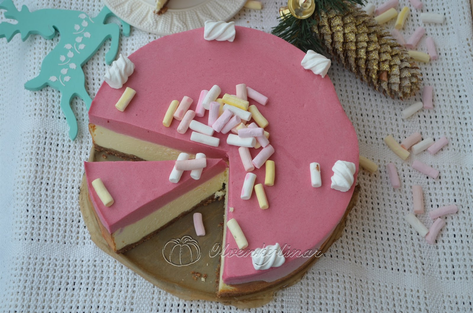 Застиглий гламурний тортик витягнути з форми. Розкрию таємницю, для того, щоб це зробити краще підігрійте борти форми феном для волосся:), не зчуєтеся як сирник вистрибне з форми. Якщо потрібно, то сирну частину можна ще відділити з допомогою лопатки чи ножа. Прикрасити за бажанням. я вирішила підкреслити його гламурність і декорувала кольоровим мініатюрним маршмеллоу.