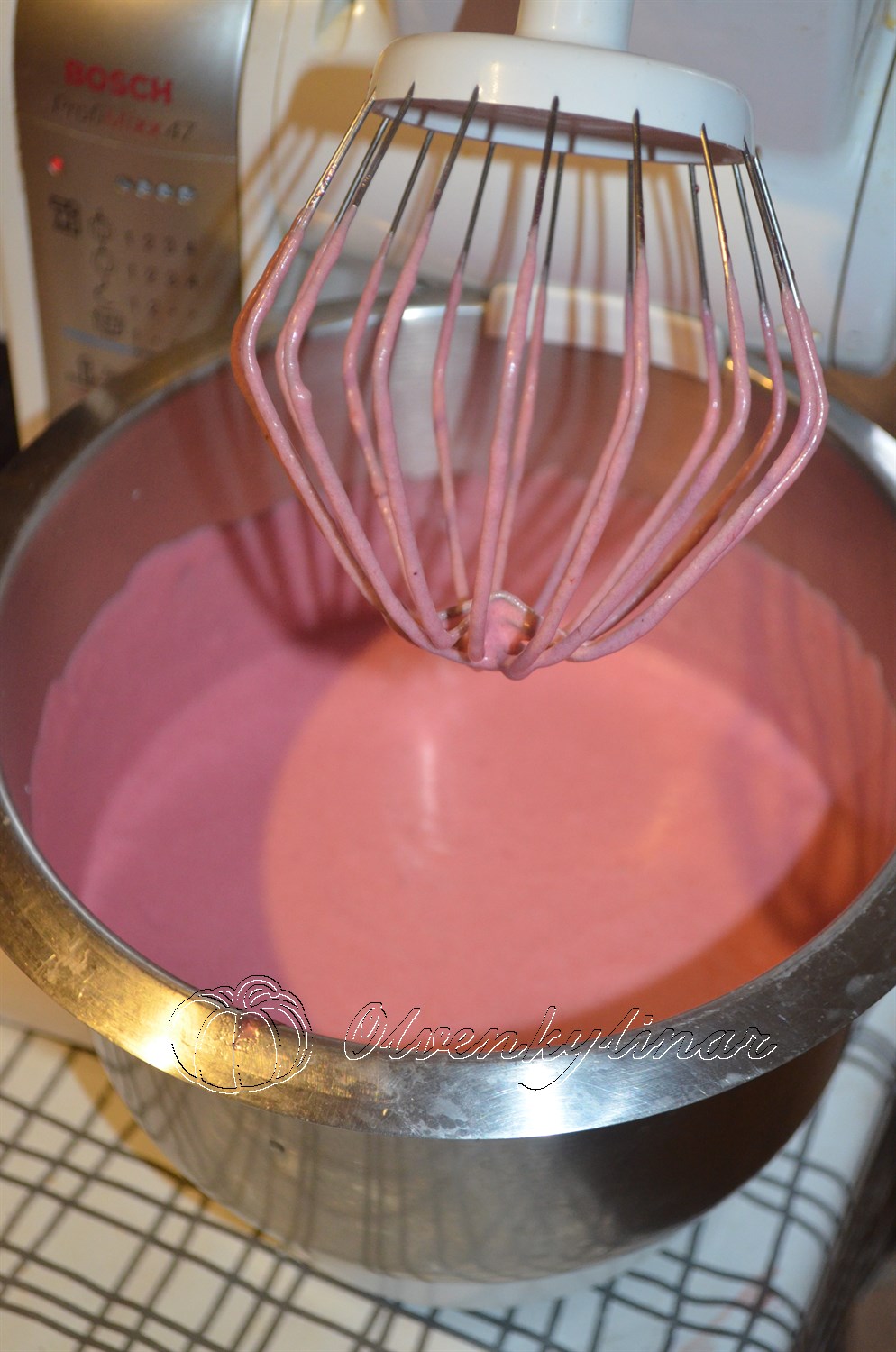 Охолоджений журавлиновий сік тоненькою цівкою, поступово влити до вершків, продовжити збивати.