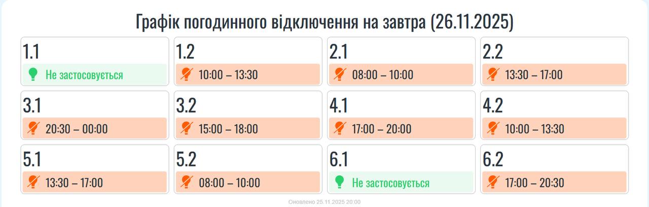 У середу, 26 листопада, по Івано-Франківській області протягом доби будуть застосовані графіки погодинних відключень електроенергії.
