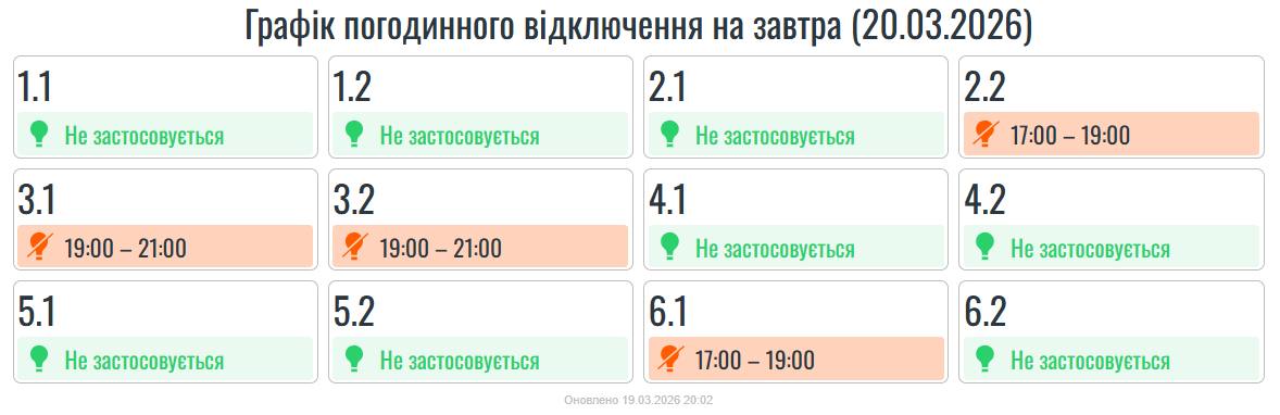 У п’ятницю, 20 березня, в усіх регіонах України, в тому числі на Прикарпатті, будуть застосовуватися графіки погодинних вимкнень.