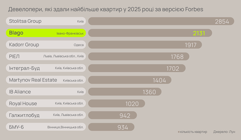 Днями аналітичний портал ЛУН та видання Forbes опублікували рейтинг забудовників, які здали в експлуатацію найбільше житла за 2025 рік. Франківська компанія blago посіла друге місце в загальнонаціональному списку, увівши в експлуатацію 2131 оселю.