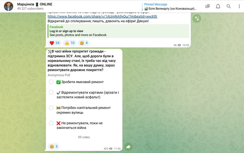 Одразу після ефіру в телеграм-каналі Марцінківа з’явилося опитування, як саме варто ремонтувати дороги: робити ямковий ремонт, стелити новий асфальт латками, робити капітальний ремонт чи взагалі не ремонтувати.