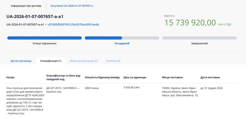 У січні 2026 року “Муніципальна дорожня компанія” провела ще одну закупівлю технічної солі та уклала договір з тією ж ТОВ “ЗІО-СПОРТ” на суму 15 739 920 грн. За ці гроші придбали 4000 тонн за вартістю 3 934,98 грн за тонну. Договір діятиме до 31 грудня 2026 року.