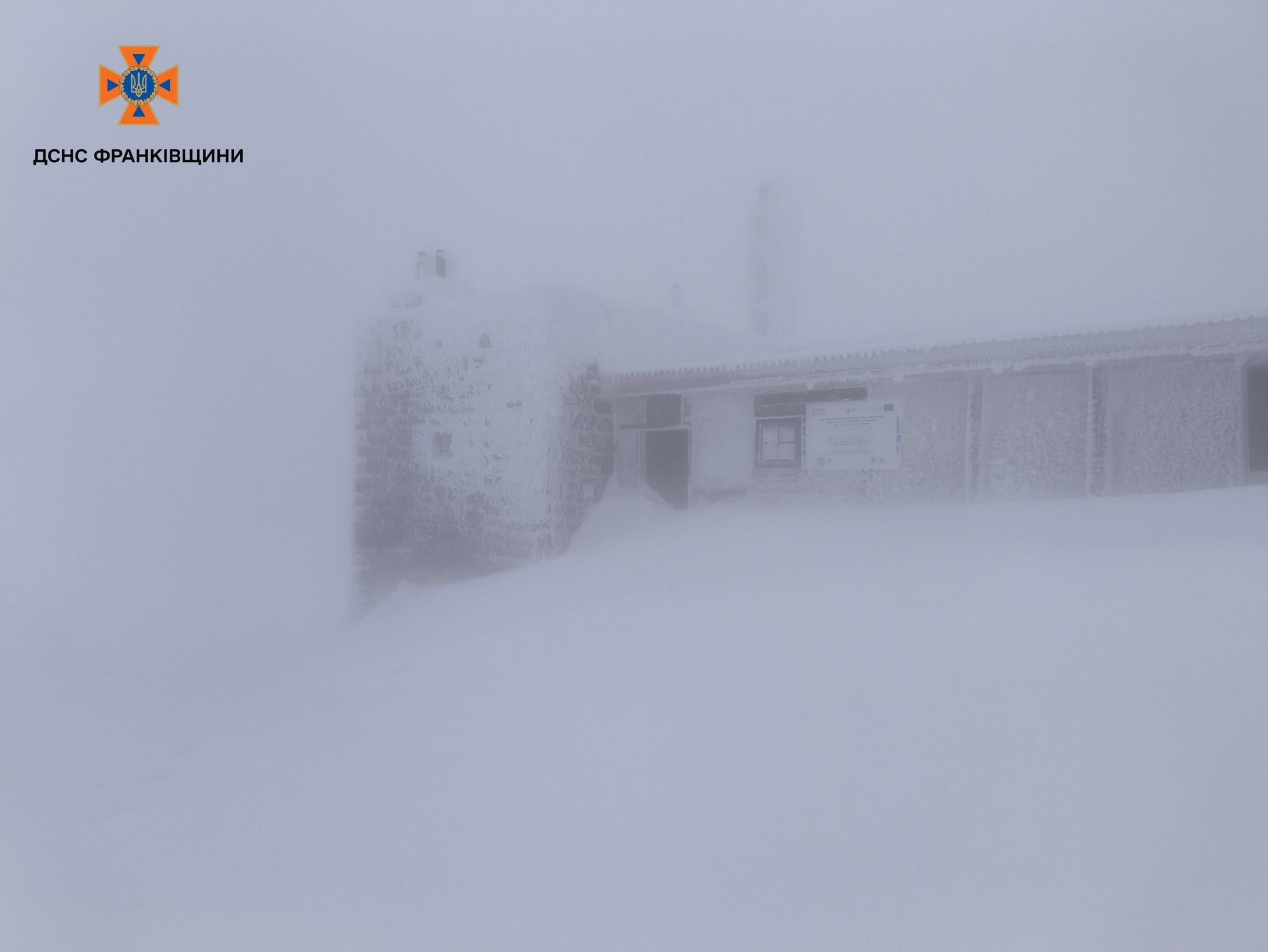 Сьогодні, 29 жовтня, на горі Піп Іван Чорногірський хмарно, видимість до 30 м. Вітер південно-західний 15-17 м/с, температура повітря -3°С.