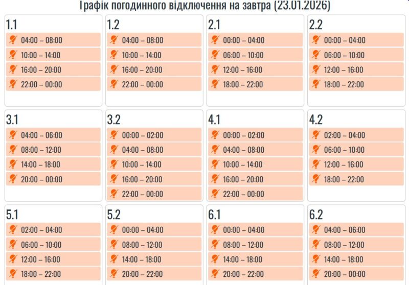 У п’ятницю, 23 січня, в Івано-Франківській області, як і в інших регіонах України, застосовуватимуть погодинні графіки вимкнень світла.