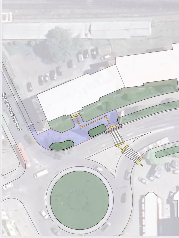 - Замінити покриття пішохідних переходів на асфальтне, адже пересування по крупному каменю є складним для людей на кріслах колісних та пасажирів з валізами. Окрім цього, асфальт дозволить нанести чітку і довговічну дорожню розмітку.