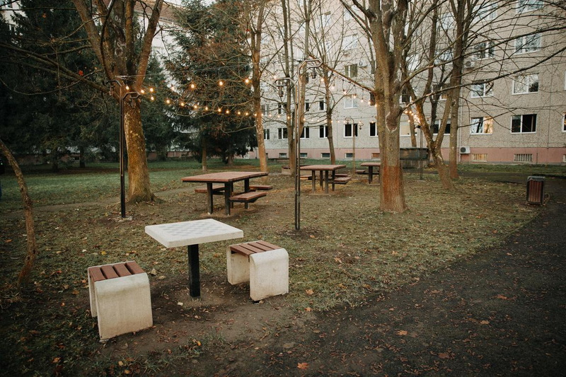 Катерина Загородня додає, що заняття на вулиці дають пацієнтам додаткову мотивацію.Разом із тим майданчик має і зони відпочинку: місце для гри в шашки, столики, де можна пообідати чи відпочити.