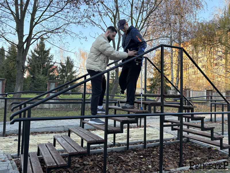 Тут мені допомогли піднятися на ноги, бо на цю ногу я взагалі не міг стати, – розповідає Руслан. – Якщо не втриматись трошки, можна легко покотитися. Наприклад, якщо неправильно поставиш милицю. Або ставиш милицю, потім стрибаєш ногою і нога зісковзує, тоді можна впасти. Якщо хочеш ходити, то треба прислухатися, займатися різними вправами. І ці сходинки якраз допомагають долати невпевненість і страх.