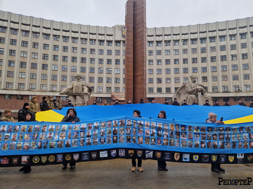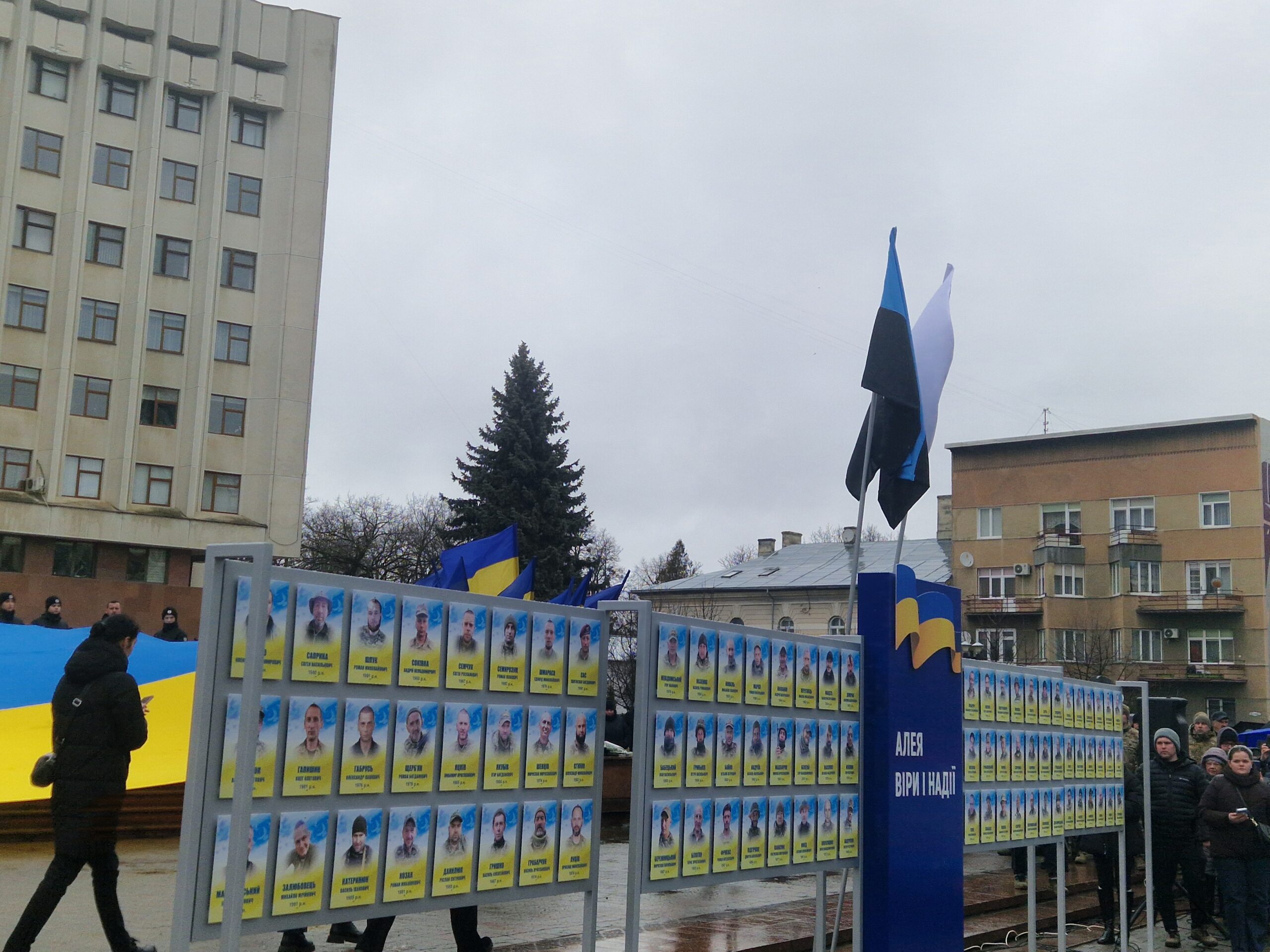 Перед урочистим освічення рідні захисників винесли довжелезний банер з портретами своїх рідних. Також символічно на алея підняли два прапори, які пошили дружини та матері.