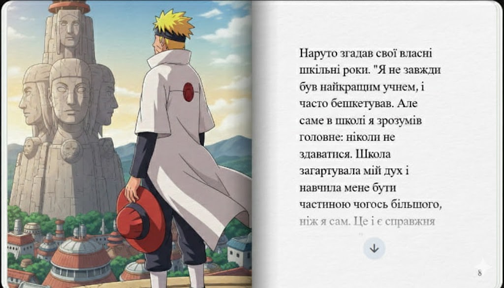 Святик не хоче йти до школи. Але любить Наруто, – продовжує жінка. – Я іду до Gemini, вони якраз тоді випустили функцію створення сторібуків. І прошу – напиши історію від імені Наруто, чому варто ходити до школи. І це працює.