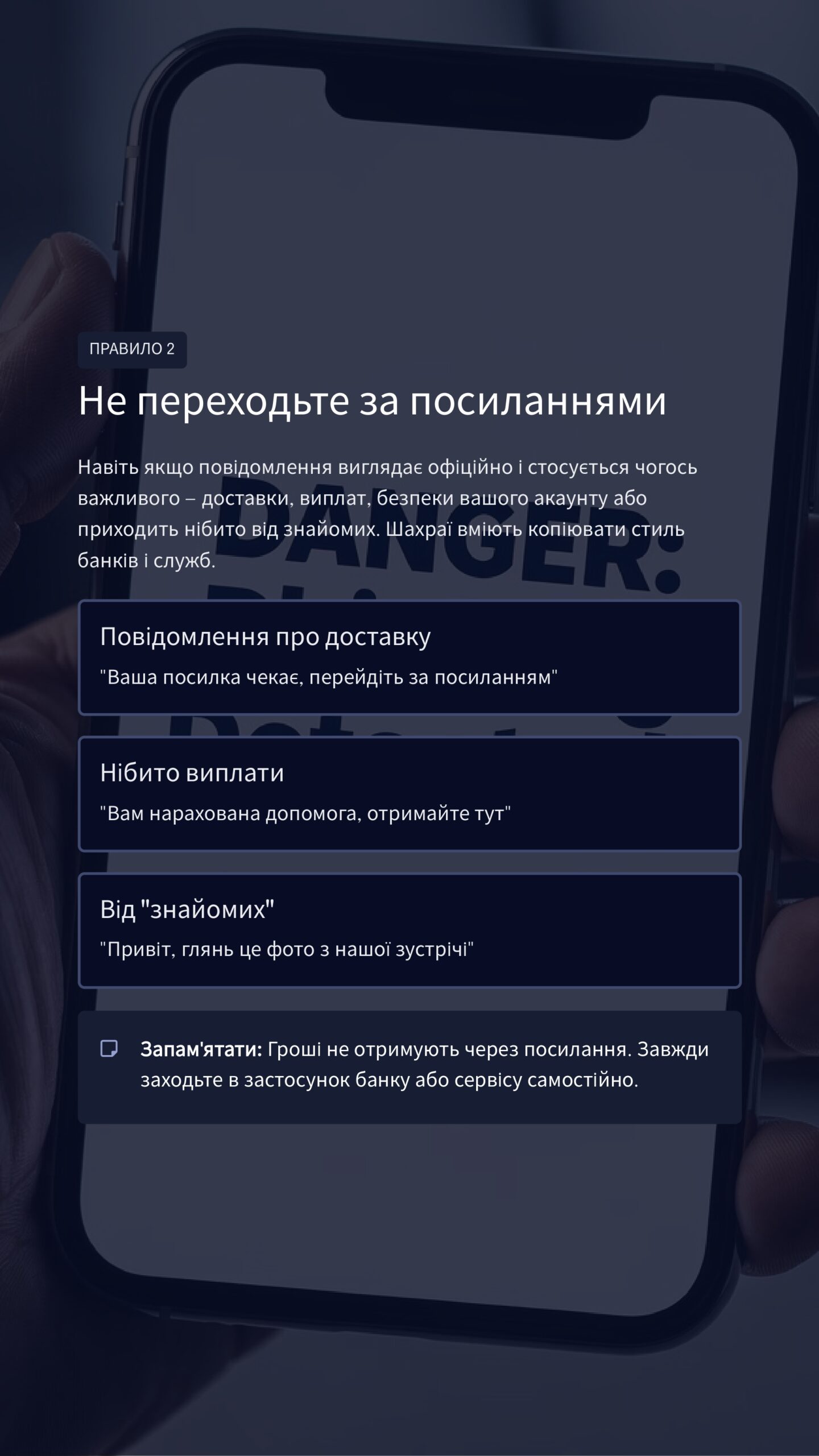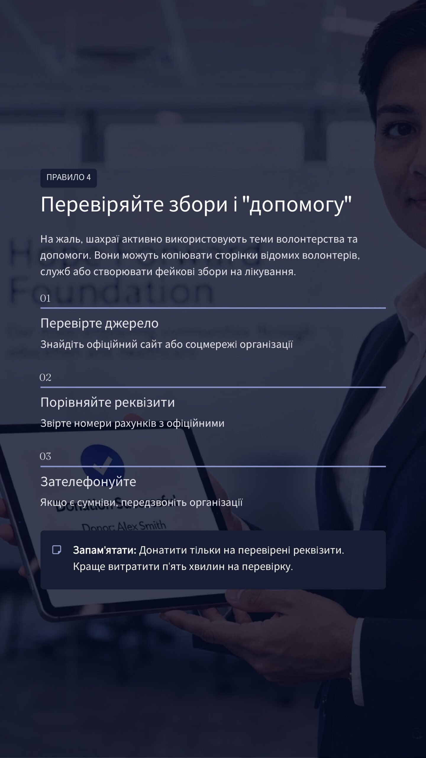 Я попросила штучний інтелект знайти в Опендатаботі матеріали про усі види шахрайств в Україні за 2025 рік. І на кожний із них написала протидію. Разом, звичайно, із штучним інтелектом, – каже вона. – І потім зробила пам’ятки. Це відповідь на кожен вид шахрайства – одна суто для людей 60+, інша – для їхніх дітей.