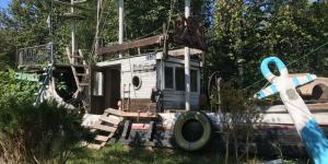 Десь у гаражі грає AC / DC Highway to hell, зліва стоїть здоровенний дерев’яний корабель, далі під плотом – ще один.