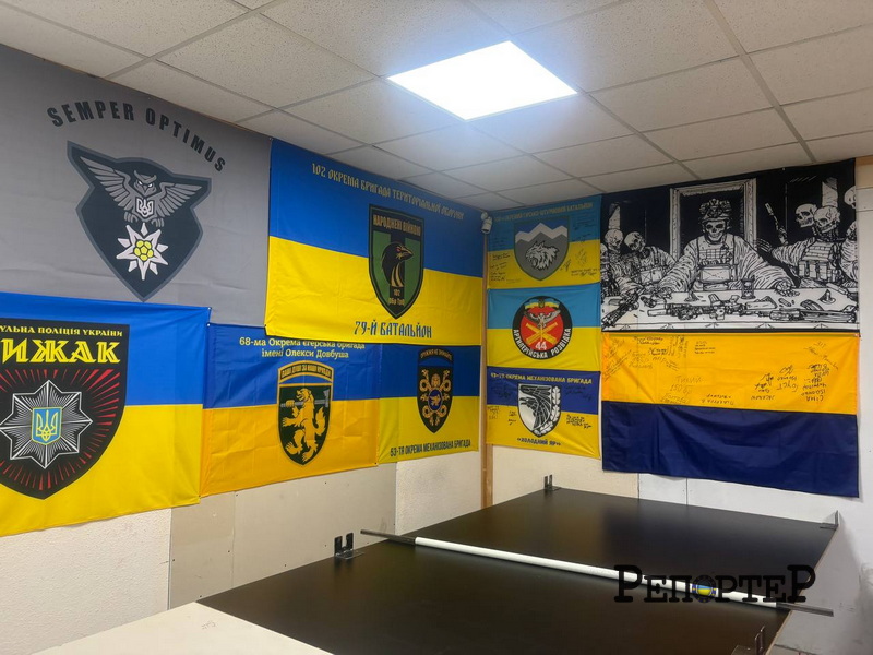 Усі стіни просторого приміщення Гуманітарного штабу обвішані прапорами з підписами військових. Поруч – шеврони різних бригад, підрозділів, батальйонів.