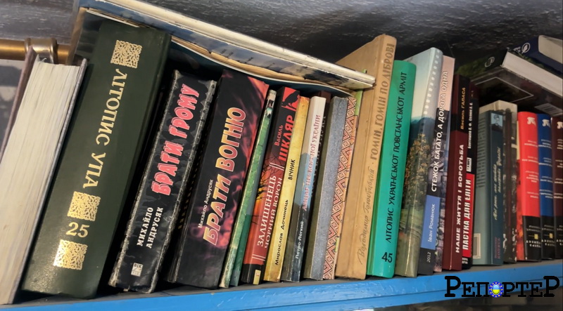 На полицях дуже багато книг, на столі фотографії, альбоми, календарі. Усі книги про УПА, а на фото й календарях – повстанці.