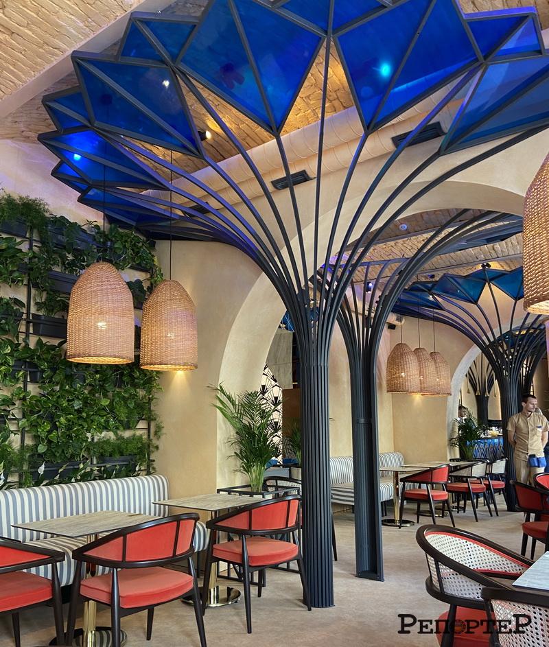 Вишуканий ресторан на початку стометрівки своїми родзинками обрав ігристе вино й морепродукти. Влітку тут можна насолодитися краєвидом за столиком на даху п’ятого поверху, а взимку – у світлому залі.