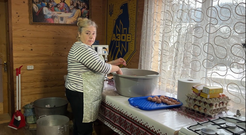 З одної кімнати до другої бігає Оксана Семчук. Жінка контролює все, аби всього ставало, аби її помічницям було зручно. Розказує, що сьогодні вони готують для військових гречку з підливкою та фрикадельками, а напередодні був горох з куркою.