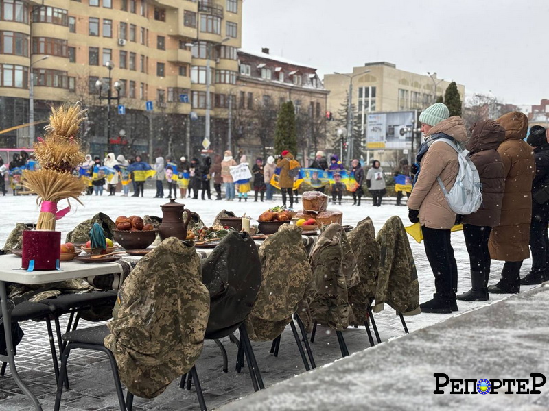 Перед театром накрили стіл із різдвяними стравами, а поруч розставили порожні стільці з військовим одягом — як символ захисників, на яких чекають з полону або про долю яких досі нічого не відомо.