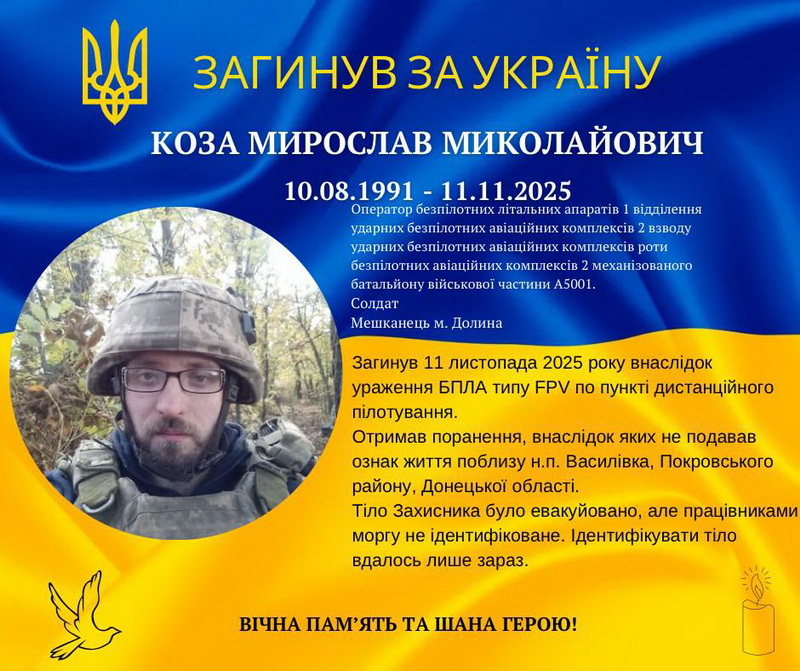 Також Іван Дирів повідомив про те, що підтвердили загибель у бою мешканця Долини Мирослава Кози, який служив оператором БПЛА. 11 листопада минулого року поблизу Василівки Покровського району Донецької області він отримав смертельні поранення внаслідок атаки ворожих FPV на пункт дистанційного пілотування.