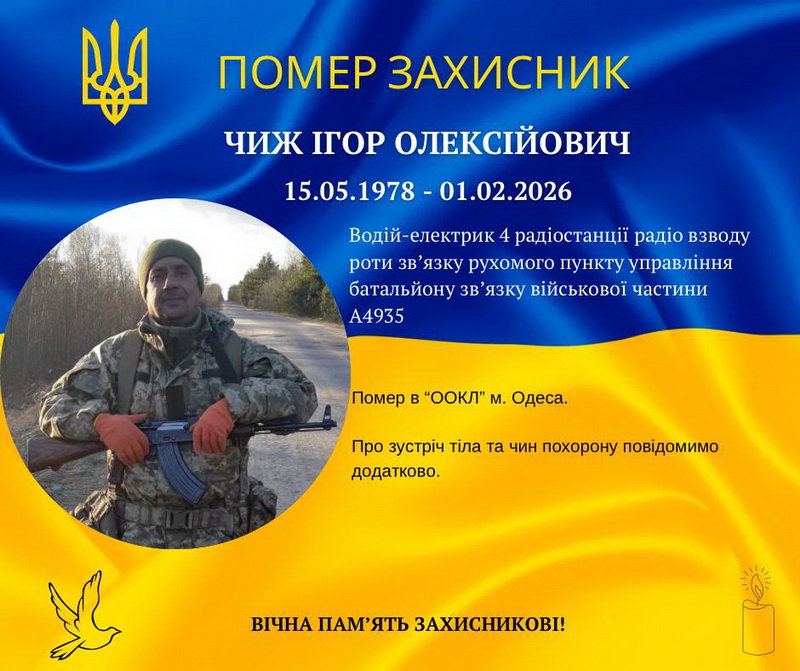 З глибоким сумом повідомляємо про непоправну втрату. Помер наш Захисник, мешканець села Мала Турʼя — Чиж Ігор Олексійович, – пише міський голова Долини Іван Дирів. – Ігор Олексійович віддано служив Україні, виконуючи свій військовий обов’язок чесно, мужньо й до останнього подиху. Він був водієм-електриком роти зв’язку, людиною, на яку можна було покластися, справжнім воїном світла, який щодня наближав нашу Перемогу. Його життя — це приклад гідності, відповідальності та любові до Батьківщини.