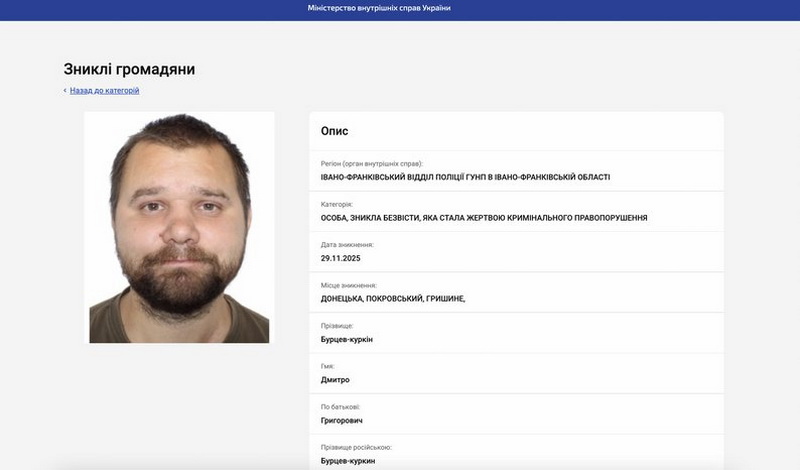На сайті Міністерства внутрішніх справ України у розділі «Зниклі громадяни» йдеться, що 29 листопада 2025 року військовослужбовець зник безвісти у селі Гришине Покровського району Донецької області. Цей день вважається датою загибелі Дмитра Бурцева-Куркіна.